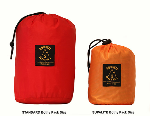 With nearly half the pack size and weight , compared to the standard bothy bag, it is Ideal for mountain Bikers, Fell Runners & Mountaineers. See pics for comparison